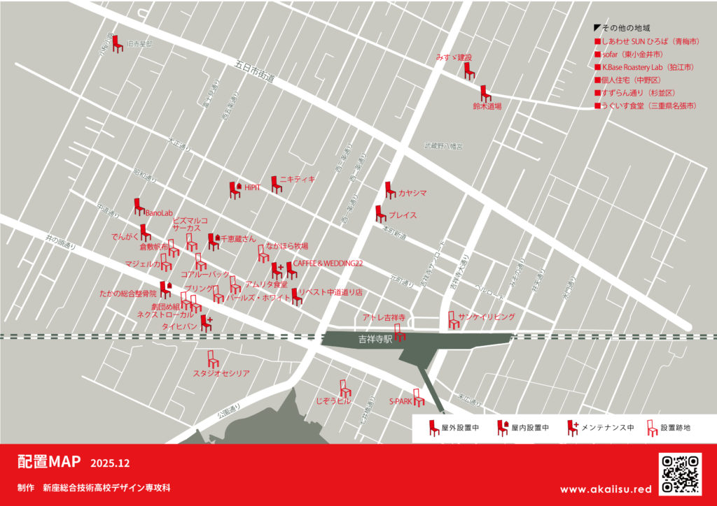 이 프로젝트는 13년 전, 키치조지 지역의 한 민간 회사가 주최한 「제1회 키치조지 커뮤니티 디자인 공모전」에 출품하기 위한 아이디어로 구체화되었다. 아카이이수 프로젝트의 주축은 키치죠지에서 건축사사무소를 운영하는 카토 씨, 카소리 씨, 그리고 마을 만들기 관련 활동을 하는 히라노 씨이다. 프로젝트 기획 단계에서 이들은 현장 조사를 실시하며, 길가에 서 있거나 휴식을 취하는 고령자들을 대상으로 인터뷰를 진행하였다. 그 과정에서 “마을 내에 잠시 쉴 수 있는 공간이 부족하다”는 의견이 반복적으로 제기되었다. 이와 같은 일상적이면서도 절실한 요구에 부응하고자, “거리 곳곳에 의자를 설치하자”는 아이디어가 도출되었으며, 이후 지금까지 13년 동안 프로젝트를 진행하고 있다.